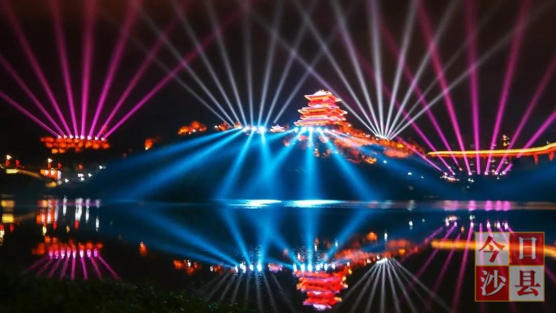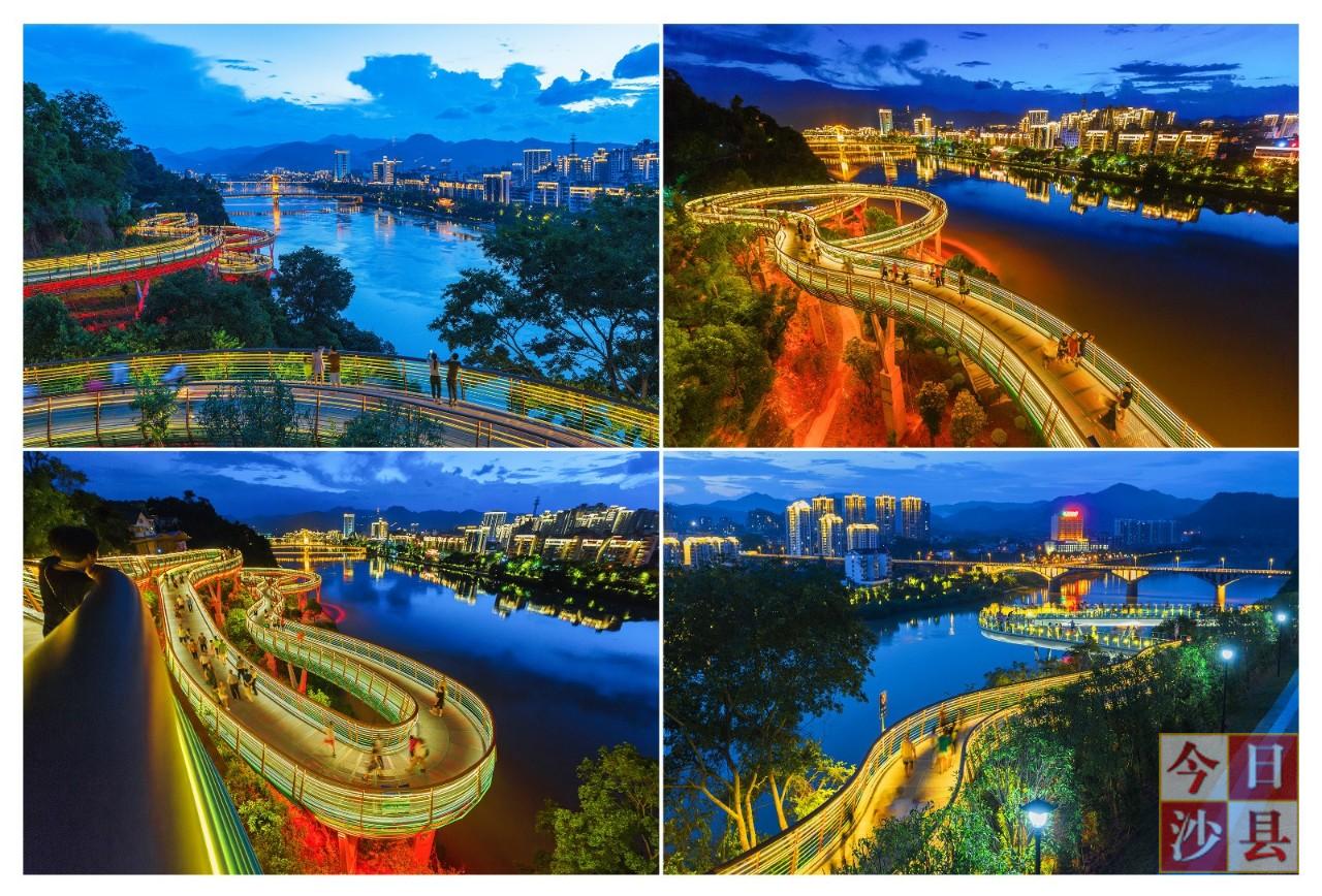 夜幕降临,月光倾泻,灯影余晖,沙县又有另外一番韵味。8点半, 灯光秀准时开始,五彩缤纷的射灯,伴着乐曲,时而激情四射,时而轻柔曼舞,射灯的速度与色彩旋转变化,融合在山水间,融合在七峰叠翠栈桥、凝翠阁的景色里,为虬城的夜晚勾勒出一幅幅绚丽多姿的画卷,时间仿佛定格在这一刻,令人久久不愿离去。