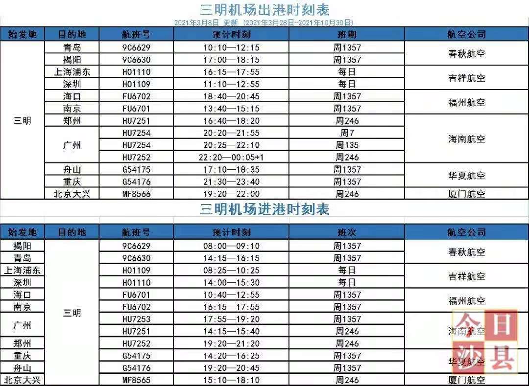 自2021年3月28日起,三明沙县机场进入夏航季,由6家航空公司执飞7条航线,通达北京、上海、广州、深圳、青岛、南京、郑州、揭阳、舟山、海口、重庆共11座城市,为旅客出行提供更多的选择。