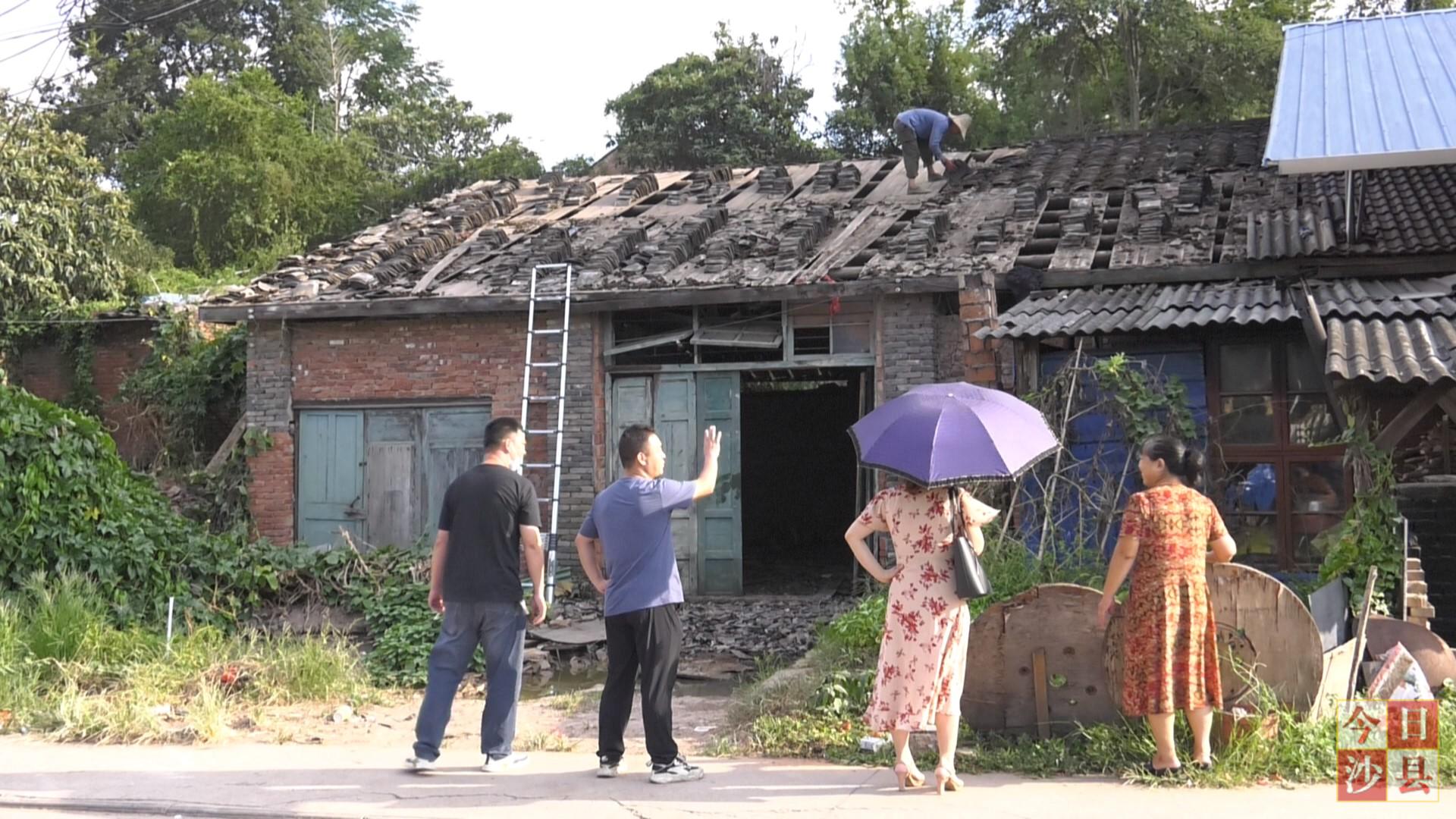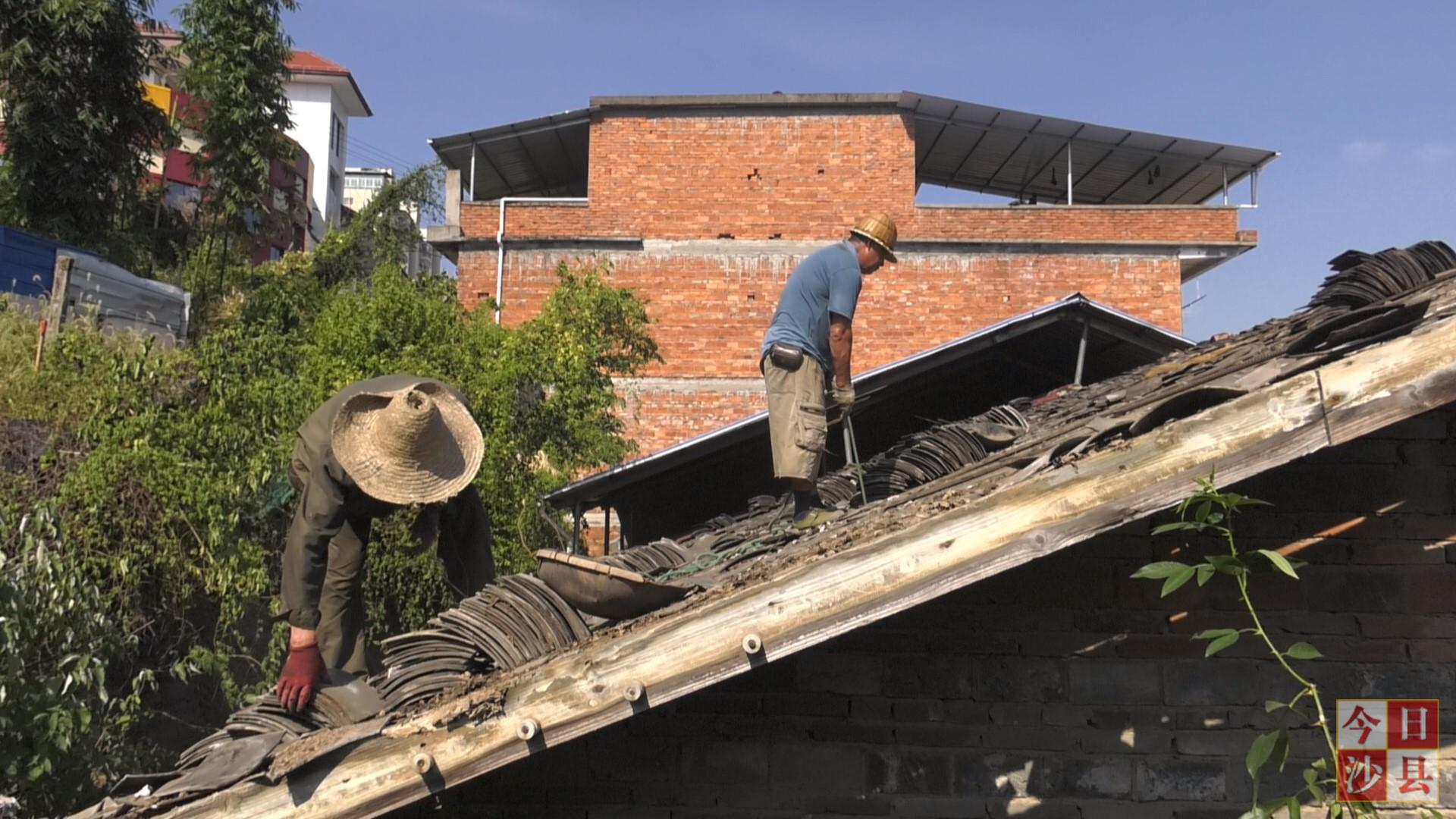 在洋坊路上,几名工人正在拆除涉征户谢女士家的房屋瓦片,这是虬江幼儿园路网征迁项目中唯一一户涉迁房屋。