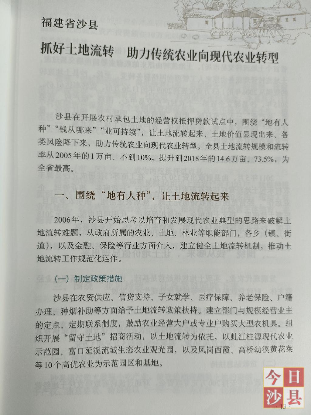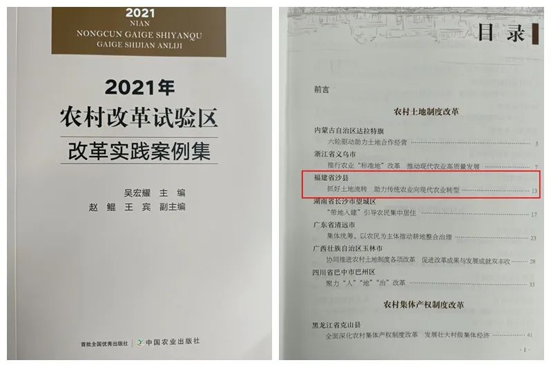 近日,农业农村部组织出版《2021年农村改革试验区改革实践案例集》,汇总了近年来43个全国农村改革试验项目,其中沙县区土地流转工作经验《抓好土地流转 助力传统农业向现代农业转型》作为改革经验刊发。