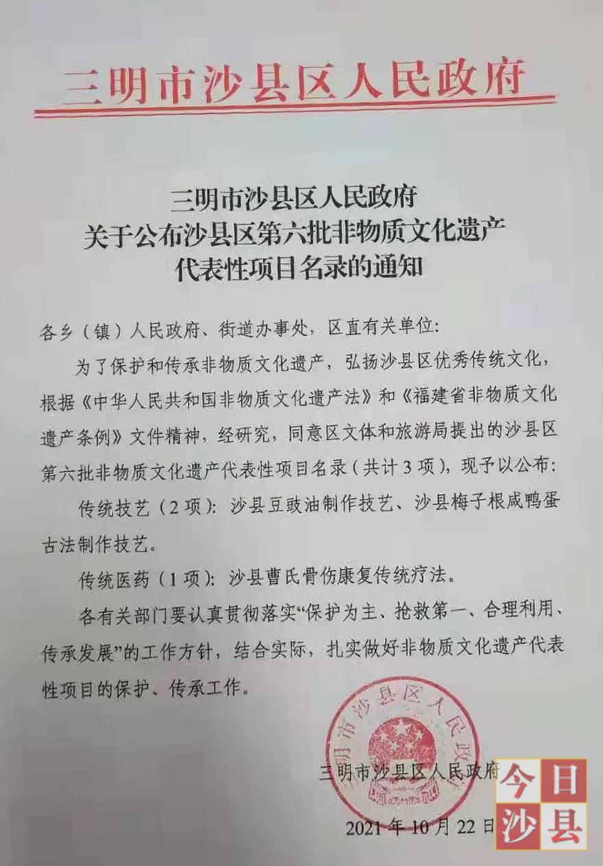 日前,三明市沙县区人民政府公布了沙县区第六批非物质文化遗产代表性项目名录,两项传统技艺和一项传统医药榜上有名。传统技艺:沙县豆豉油制作技艺、沙县梅子根咸鸭蛋古法制作技艺。传统医药:沙县曹氏骨伤康复传统疗法。