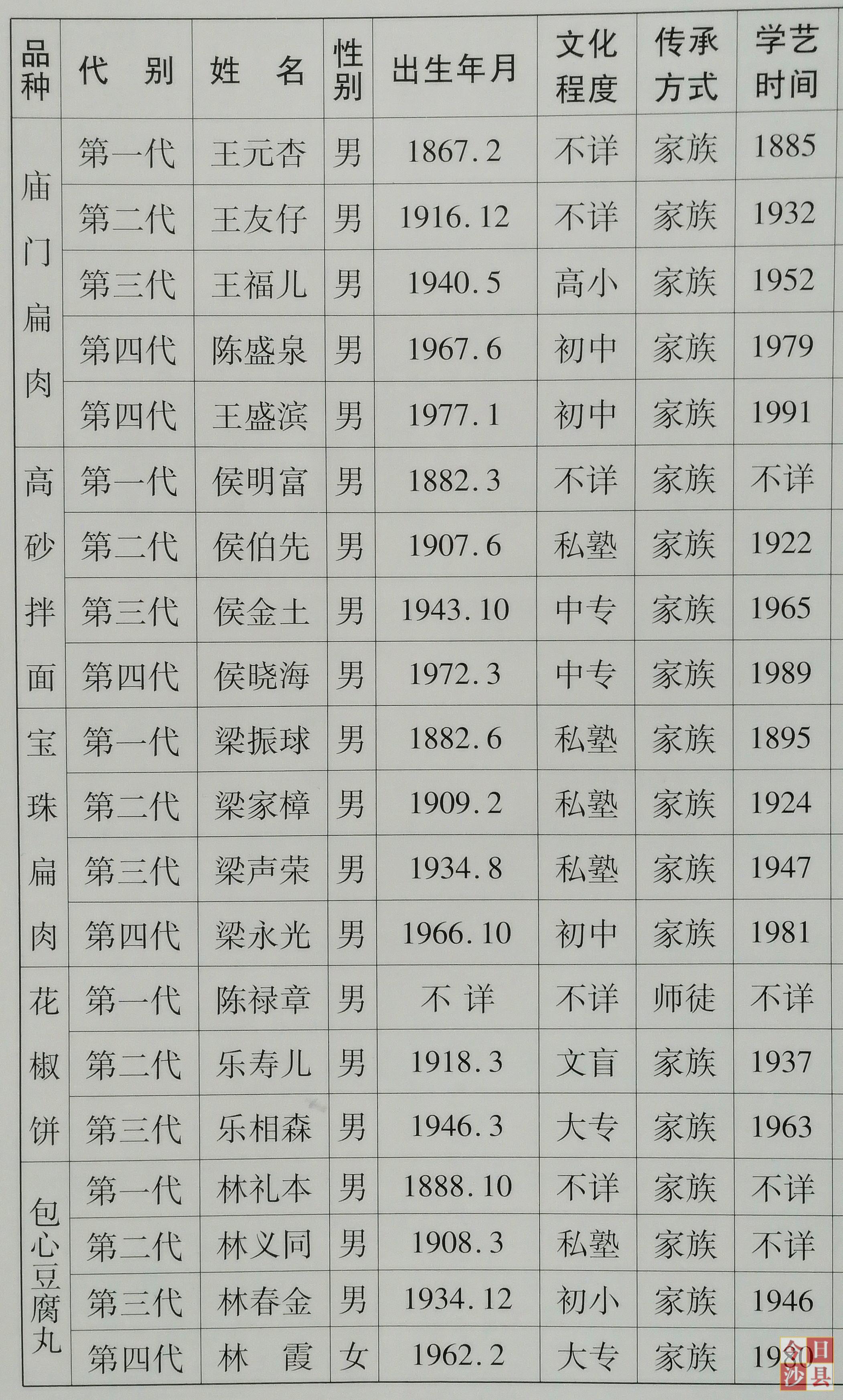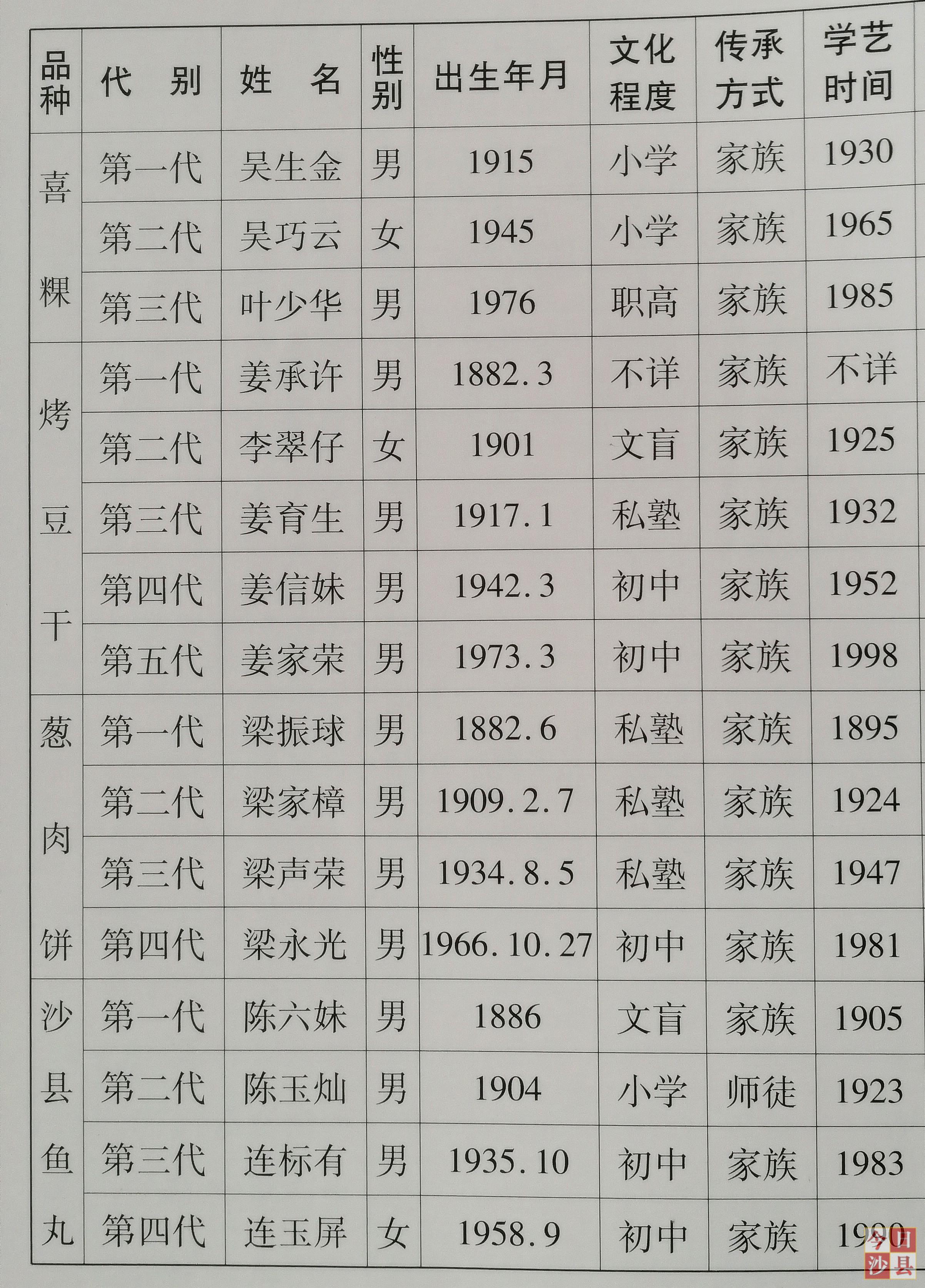 沙县小吃第一批技艺传承人及早期部分品种传承谱系