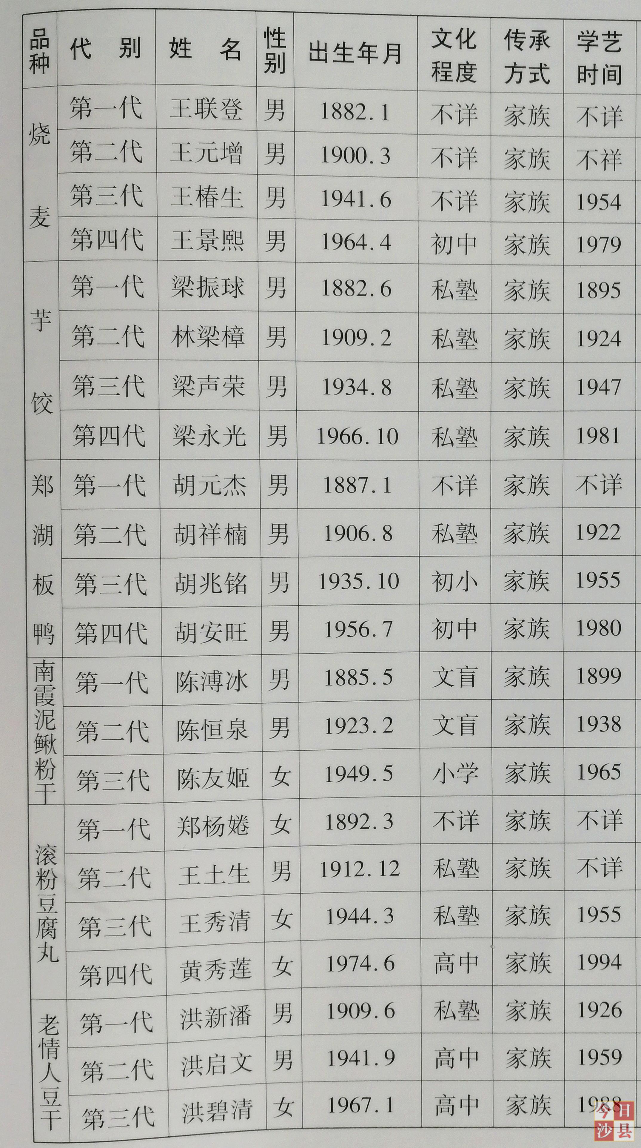 沙县小吃第一批技艺传承人:王景熙(佳兰烧麦)、陈盛泉(庙门扁肉)、王盛滨(庙门扁肉)、侯晓海(高砂巷子拌面)、侯晓松(高砂巷子拌面)、黄秀莲(阿莲豆腐丸)、姜家荣(姜氏铁门烤豆干)、梁永光(宝珠葱肉饼)、梁永辉(宝珠葱肉饼)、李贤锦(李记锅贴)、张名容(名容芋饺)、林隆杰(珍儿百果糕)、胡绍椿(垚香胡记板鸭)。