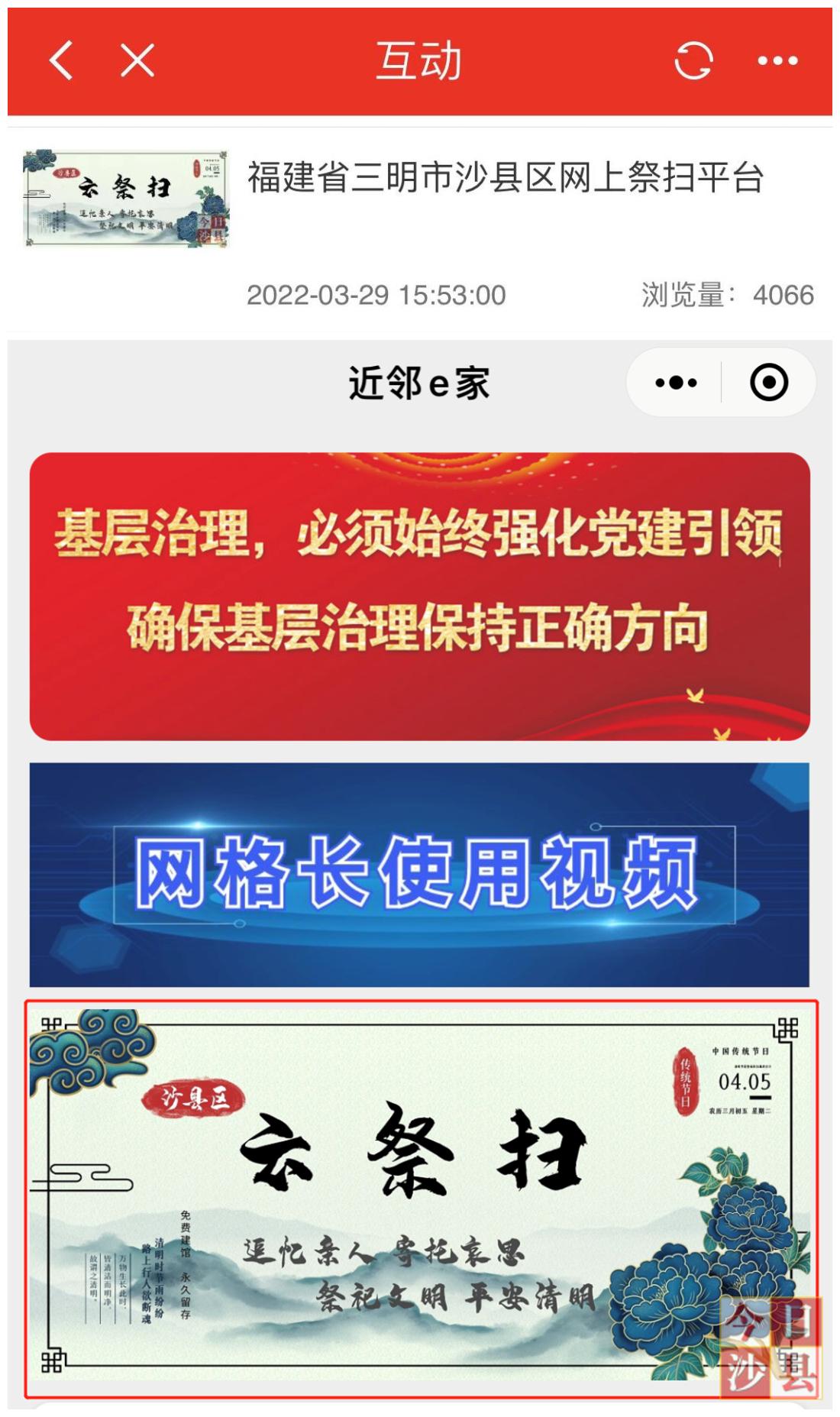 据了解,在疫情防控的重要节点,为有效减少人员聚集,阻断疫情传播,沙县区暂停所有公墓(陵园)、骨灰楼等祭拜场所现场祭扫活动。同时,在“今日沙县”APP和“虬城近邻e家”微信小程序上开设云祭扫服务平台,供市民“云祭扫”,寄哀思。