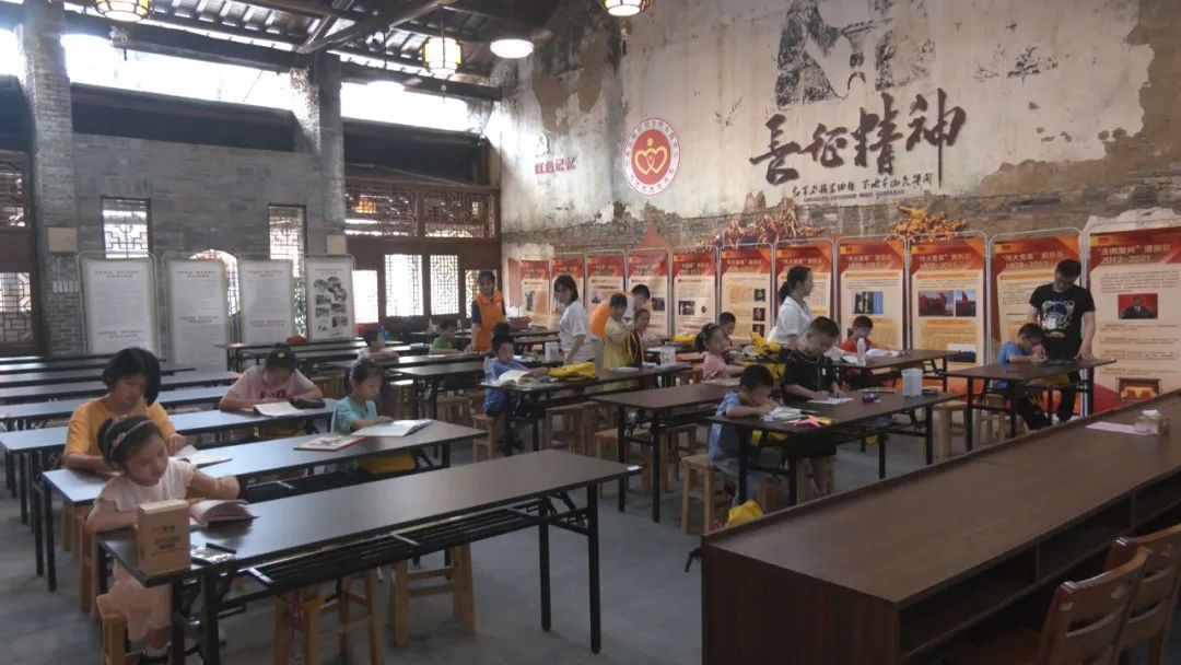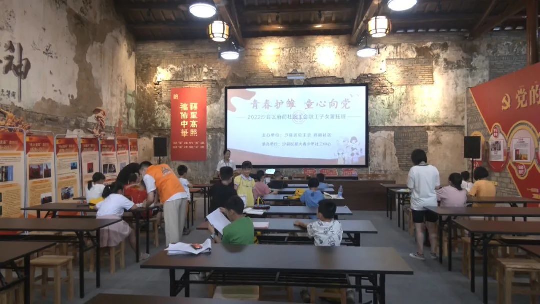 8月3日上午,在凤岗街道府前社区新时代文明实践站内,20余名小学生在志愿者的辅导下做暑期作业、看书练字,这是该社区新时代文明实践站新开设的“青春护雏•童心向党”2022府前社区工会职工子女暑托班项目。