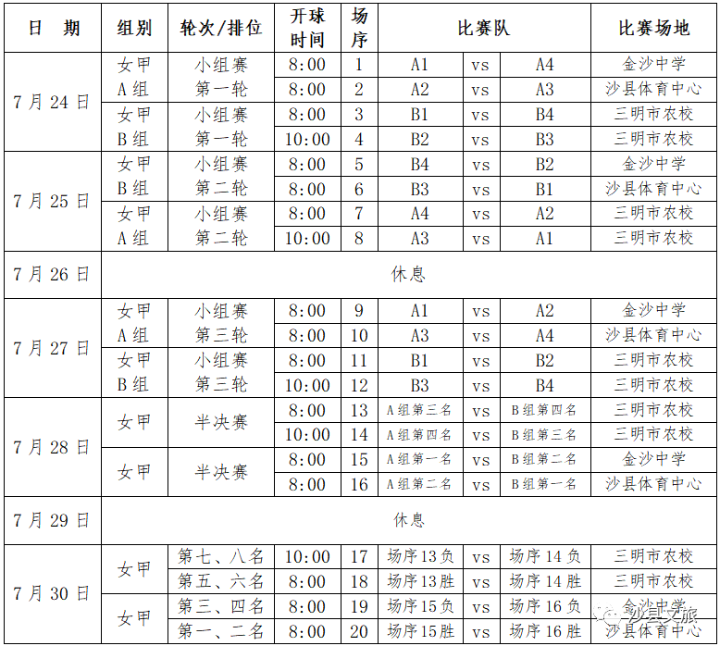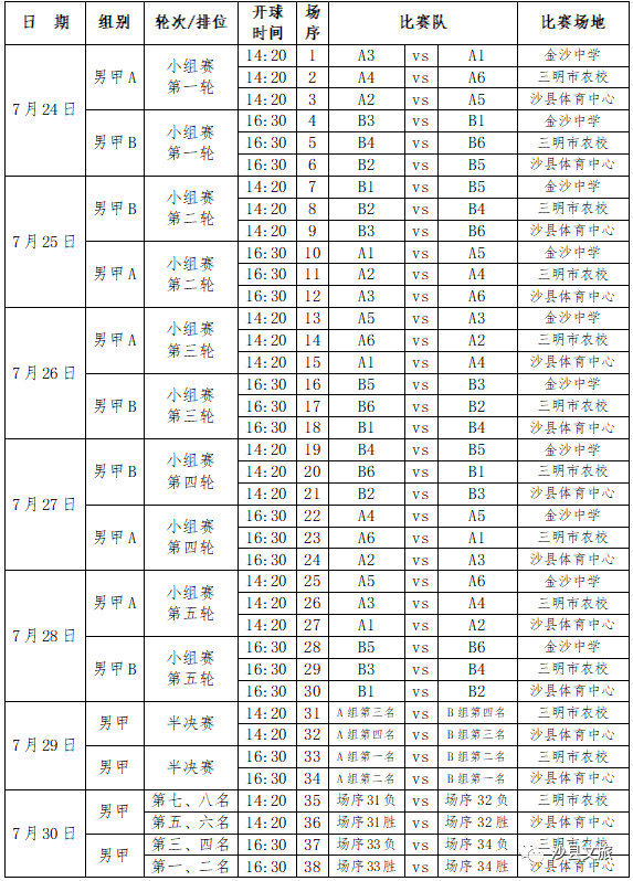 本次锦标赛将持续到7月30日。比赛采用先抽签分组单循环再交叉排位的竞赛方式展开比赛,在沙县区体育场、三明市农业学校体育运动场、沙县区金沙高级中学田径场3个赛场同时进行,每天上午进行女子组比赛,下午进行男子组比赛;其中,沙县区体育中心赛场对外开放,大家可前往观赛。(记者:周端明)
