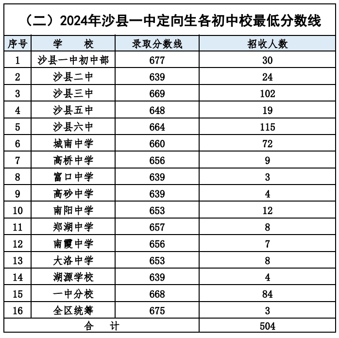 2024年沙县区中招录取线公布