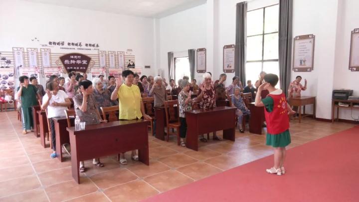 7月16日上午,在位于夏茂镇洋元村的乐龄学堂内,50余名年过花甲的老人齐聚一堂,正在志愿者老师的带领下一边朗诵古诗,一边练习手势操。老人们表示,因为有了乐龄学堂,留守在村子里不再寂寞,同时还可以识文断字,与时俱进。