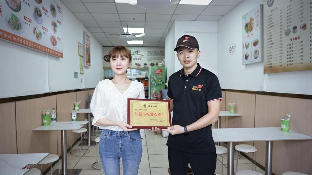 在深圳龙岗区玉岭花园沙县小吃店,调研组向潘玉铨授牌并肯定其善举,指出黄怀淋、潘玉铨两位沙县小吃爱心业主面对求职困境毕业生,以退款免单传递善意,举动虽微小却温暖异乡人,尽显沙县小吃业主的淳朴担当,是“小吃大爱”的生动体现。