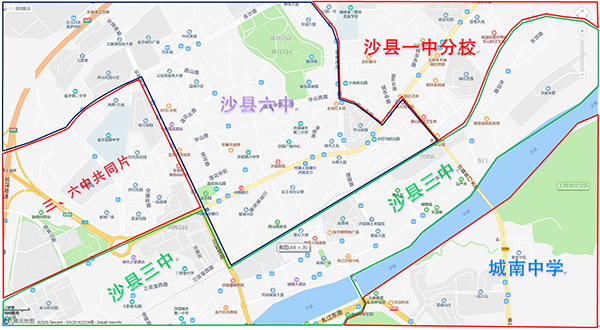 ④与沙县三中共同片区:采石场以东,长富南路以西,金沙西路延伸至长深高速公路以南,新城西路至采石场以北等村(居)委会、社区的小学毕业生。