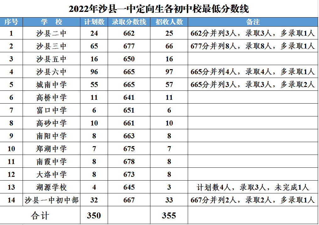 2022年沙县区高中录取分数线