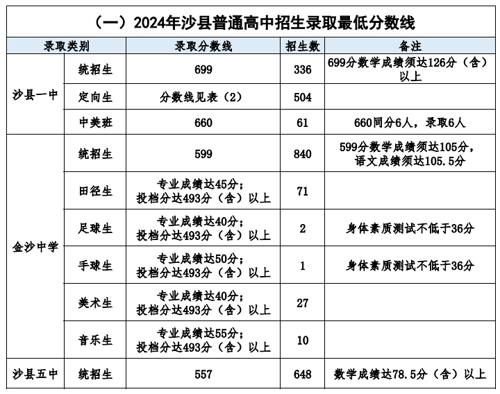 (一)沙县区普通高中统招生切线情况