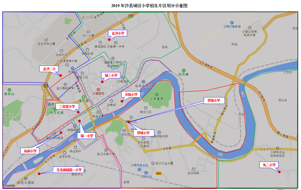 (9)生态新城第一小学。林业新村路口至原沙县机砖厂以西片区(含吉星新村、林业新村),金泉村、墩头村所辖区域范围与周边,三明北站天瑞花园(含)以西沙县生态新城所辖区域范围。原水南小学片区的水南村、陈罗坑周围及附近单位。