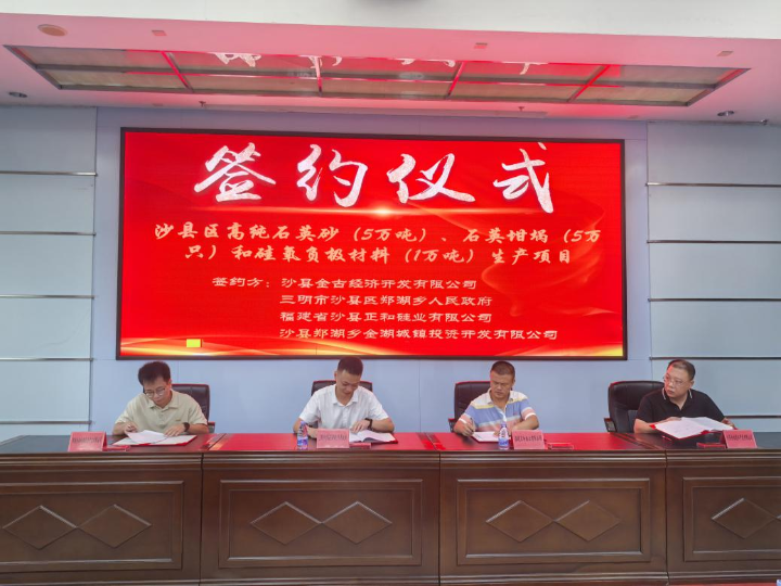 仪式上,沙县金古经济开发有限公司、三明市沙县区郑湖乡人民政府、福建省沙县正和硅业有限公司和沙县郑湖乡金湖城镇投资开发有限公司共同签署了项目投资协议,正式开启这一战略合作。项目的签约,将为沙县区的经济发展和产业升级作出积极贡献。