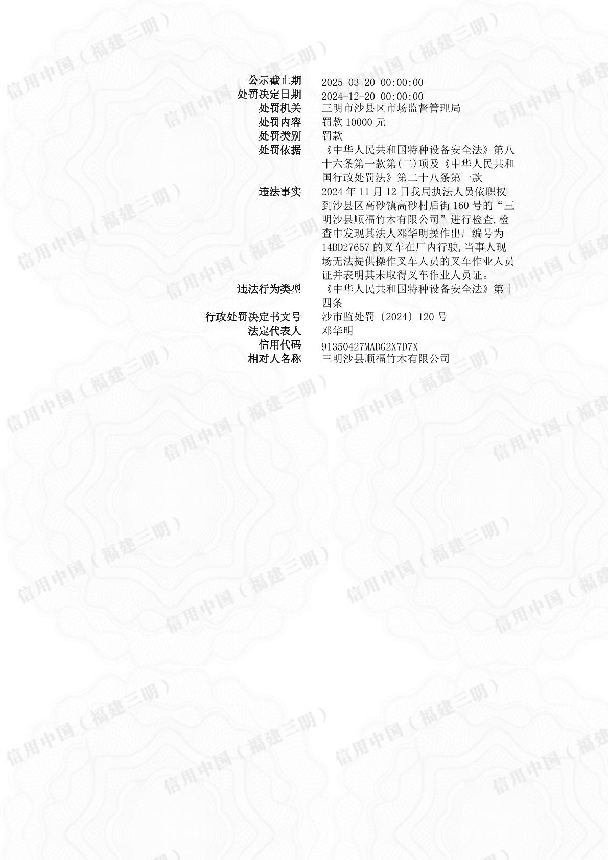 三明沙县顺福竹木有限公司行政处罚信息