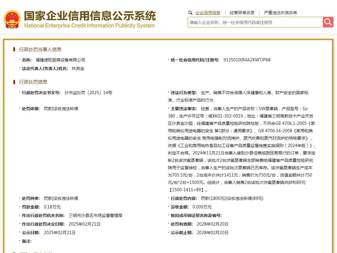 福建速旺厨房设备有限公司生产不合格的蒸煮锅行政处罚信息