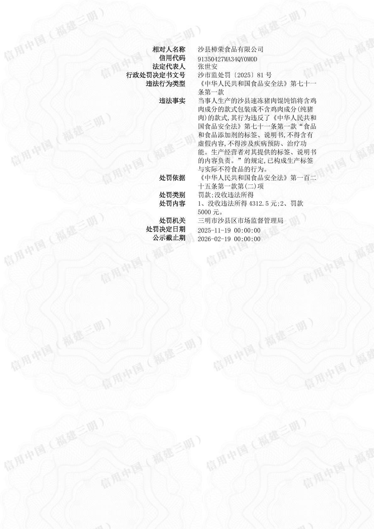 沙县樟荣食品有限公司行政处罚信息