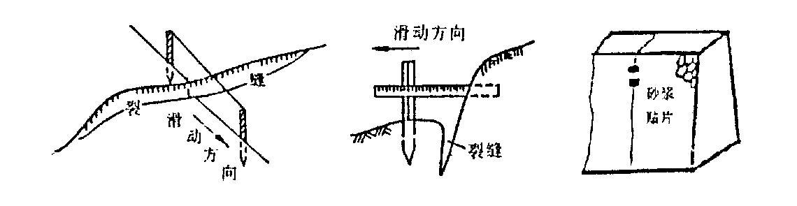 ——各灾点应结合地质灾害发生的规模、危险性、危害性、经济实力及可操作性,采取目视监测、设桩监测(图A、B)、贴片监测(图C)等,或进行回填裂缝、削坡减载、清除易滑塌物、挖设排水沟、改水防渗、砌挡墙等工程治理措施,或直接进行搬迁避让。