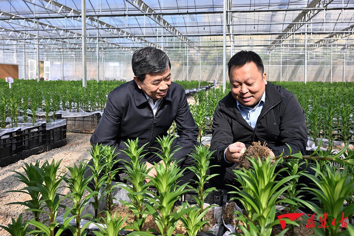 百合花产业是延平区的特色支柱产业。虽是冬日,在大横镇大横村,丛丛百合花清丽芬芳,花苗碧绿茁壮,一派生机盎然景象。周祖翼走进村里的植物工厂和种植大棚,与科技特派员交谈,详细询问百合花品种及种球繁育、花稻轮作、产业发展等情况。周祖翼说,发展好百合花产业,关键要靠科技支持。要牢记嘱托,贯彻落实省委十一届九次全会关于“提高特色现代农业发展水平”的部署,坚持科技惠农,持续完善科技特派员制度,加大种源研发培育力度,不断优化品种、迭代更新,延伸产业链条,开发高附加值产品,加快推动特色产业高质量发展,提升农业综合生产能力和质量效益,带动更多村民走上共同致富之路。
