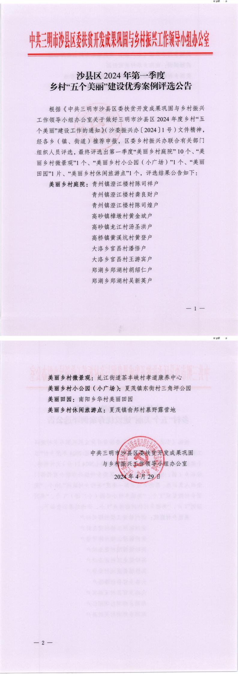 沙县区2024年第一季度乡村“五个美丽”建设优秀案例评选公告