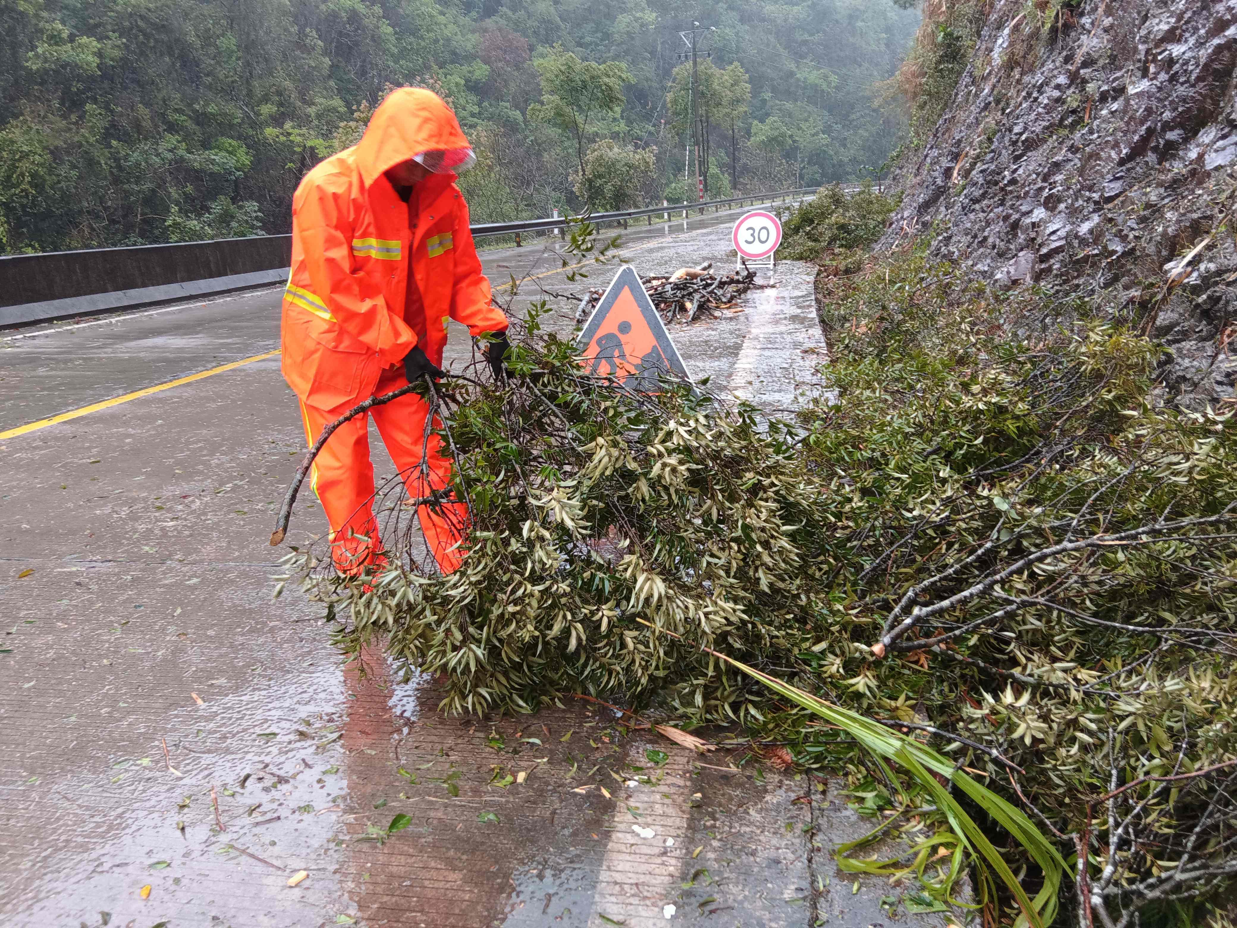 “受狂风暴雨影响,S308线大洛段出现落叶、落枝、泥土冲刷、毛竹倒伏等情况,影响正常通行,需清理的路段约有70处!”大洛公路站站长林新清在工作群里报告后,沙县公路分中心立即启动应急处置预案,迅速调配人手。由于每个公路站所管养的路段都出现了不同程度的险情,无法抽调人手,沙县公路分中心紧急召回正在休假的点工,一共出动12人分路段清理S308线大洛段的路面障碍。