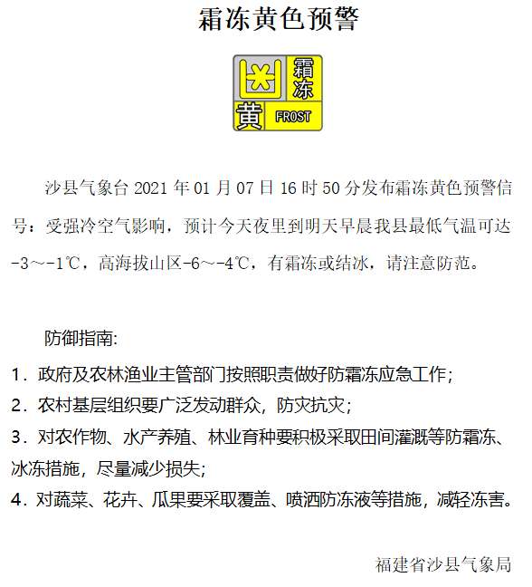 霜冻黄色预警信息(2021年1月7日16时50分发布)