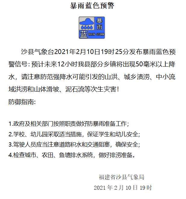暴雨蓝色预警信息(2021年2月10日19时25分发布)