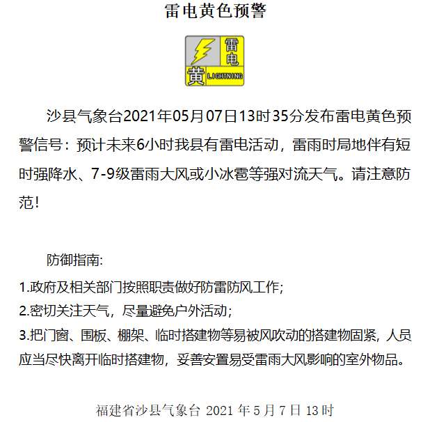 雷电黄色预警信息(2021年5月7日13时35分发布)