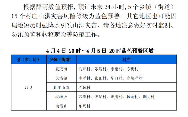 山洪灾害风险预警信息(2024年4月4日20时发布)